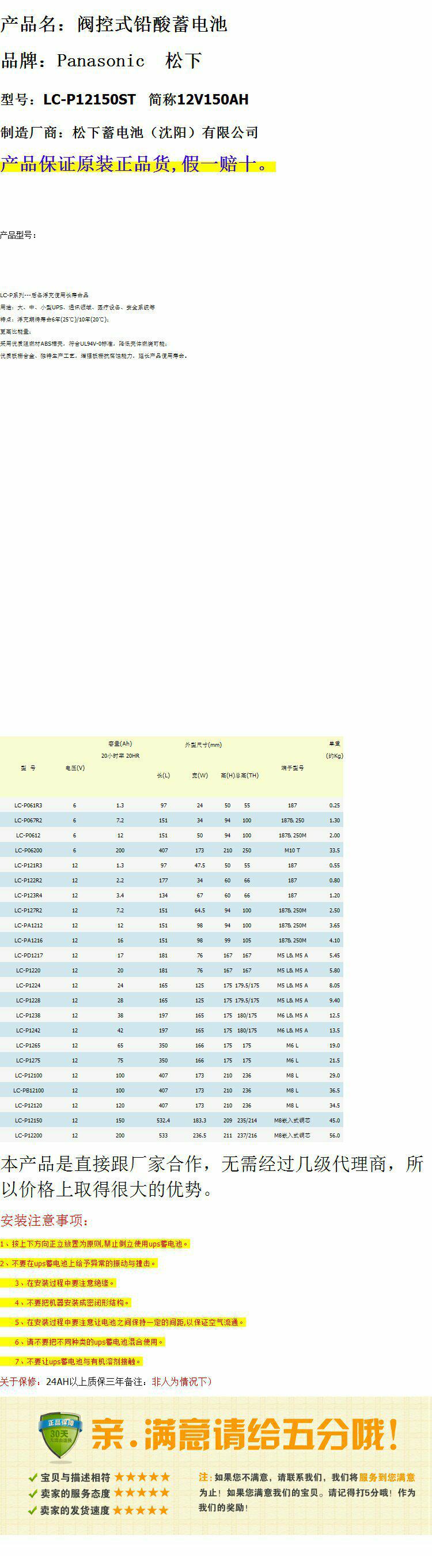 松下蓄电池12v150AH LC-P12150ST原装正品